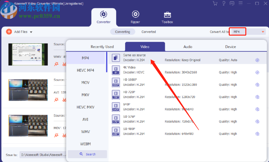 3.点击打开按钮之后下一步我们在界面右边点击格式选择的下拉列表,然后在列表中选择自己想要转换的的MP4视频格式即可。