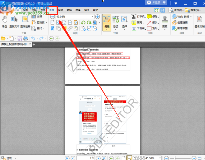 3.点击打开按钮之后我们就可以在界面中看到PDF文件的内容了,然后我们需要点击上方的页面这个功能选项,如下图中所示。