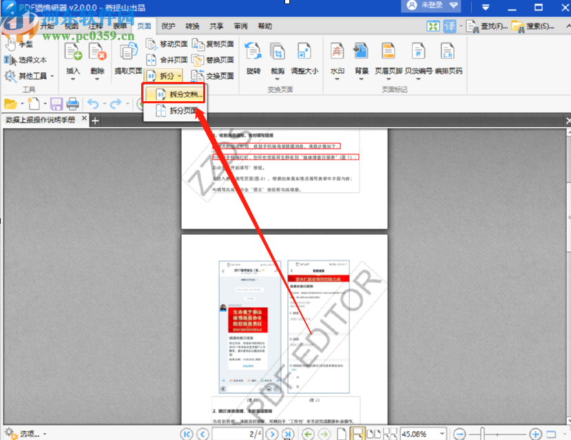 4.点击页面之后在出现的界面中我们就可以看到拆分这个功能了,点击之后在出现的选项中点击拆分文档选项。