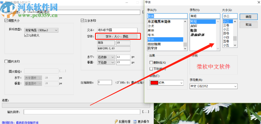 4.添加好水印的文字内容之后,我们点击“字体、大小、颜色”这个功能按钮,然后在出现的界面中就可以设置水印的颜色、字体等参数了。