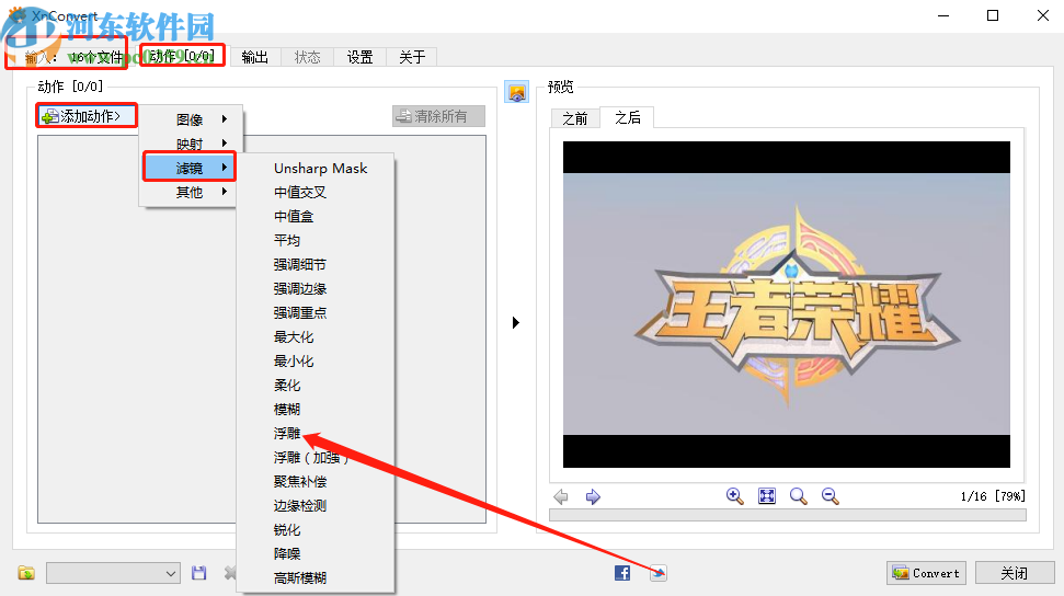 3.点击打开按钮之后文件就加载进来了,可以在界面左上角看到输入了多少个文件,然后我们切换到动作界面,点击添加动作按钮之后在滤镜的下面就可以看到浮雕这个滤镜效果了。