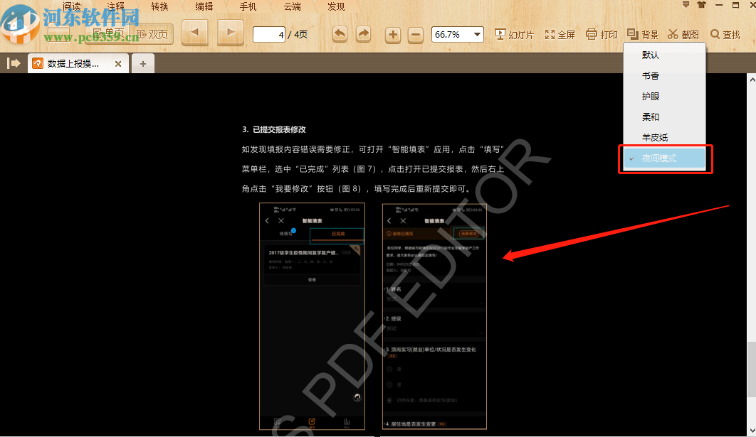 3.点击打开按钮之后我们就进入到查看PDF文件内容的阅读界面了,然后我们点击右上方的背景功能,接着在出现的选项中点击夜间模式。