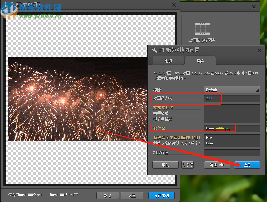 4.接下来在设置界面我们可以设置转换成png图片之后的命名方式,以及动画的最大帧这些参数,根据自己的需求设置完成之后点击应用按钮。