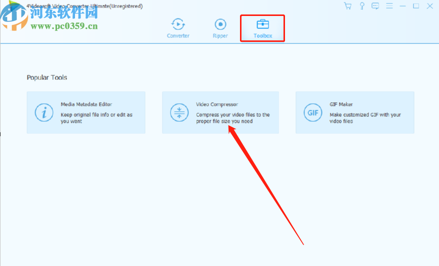 1.首先第一步我们打开软件之后点击上方的Toolbox这个工具箱选项,然后在出现的界面中就可以看到Video Compressor这个视频压缩功能了,接着点击进去。
