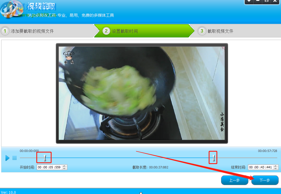 5.进入到下一步之后就是对截取片段的时间设置,我们移动下图中框出的这两个图标即可选择想要截取的视频片段,左边是选择开始时间右边是选择结束时间,选择完成之后点击下一步按钮。