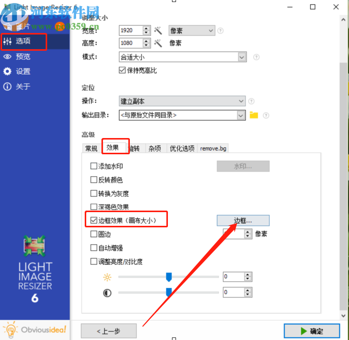 3.点击打开按钮将图片添加进来之后,下一步在界面左边点击选项,切换到图片的选项设置界面,我们在其中找到效果设置界面之后,勾选边框效果选项,然后点击右边的边框按钮。