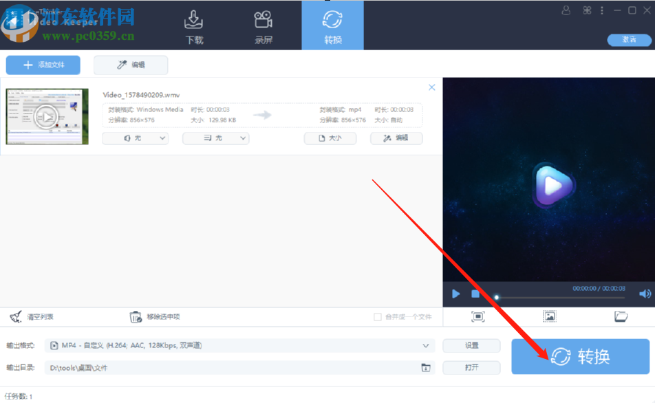 7.点击确定按钮之后就会回到软件的主界面,并且保存了对视频的裁剪操作,最后我们点击右下角的转换按钮就可以将裁剪之后的视频转换保存出来了。