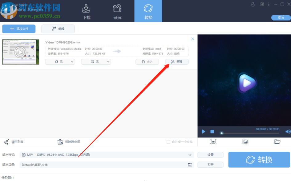 3.点击打开按钮之后在界面中可以看到添加进来的视频列表,然后我们点击编辑这个功能按钮进入到编辑视频的界面中。