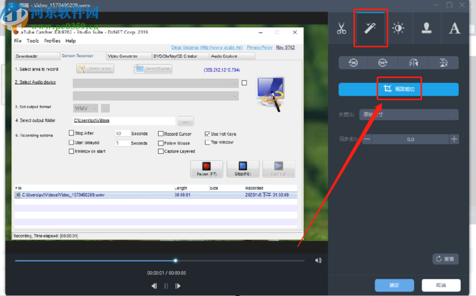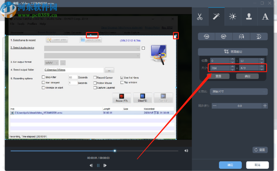 5.点击这个画面裁剪功能按钮之后,我们可以在左边的视频中调整选框边缘来选择想要裁剪的尺寸,也可以直接在大小这个选项中输入想要裁剪的尺寸。