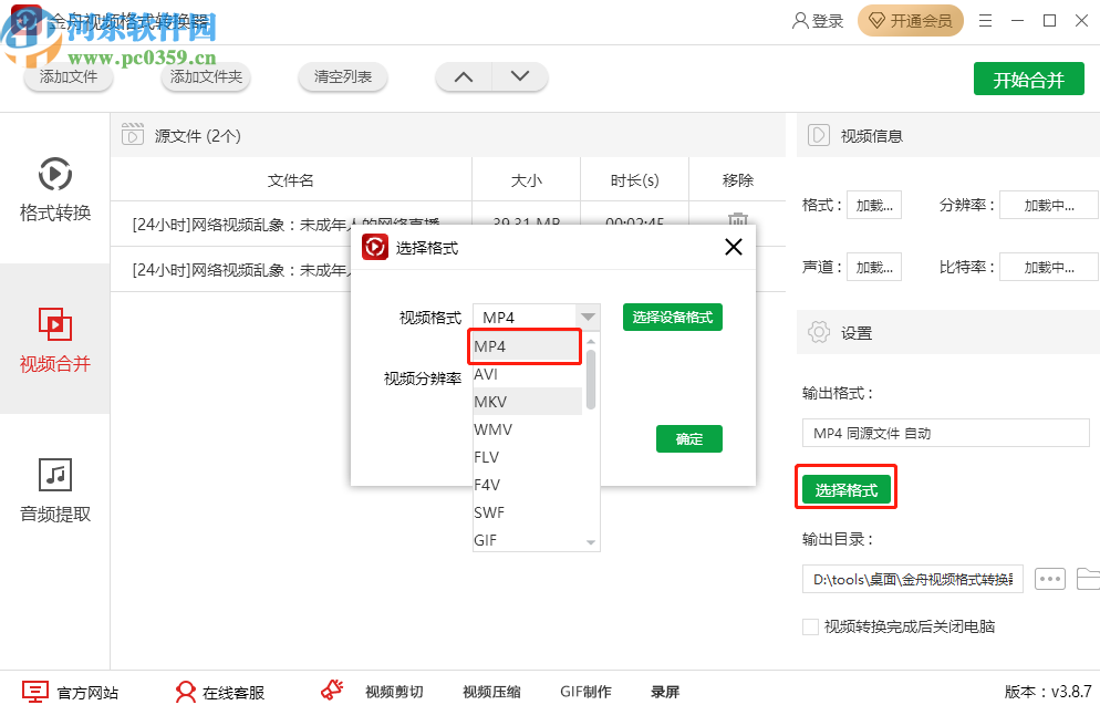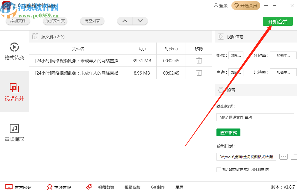 6.最后设置好视频合并输出路径之后,点击界面右上角的开始合并按钮就可以开始合并视频文件的操作了。