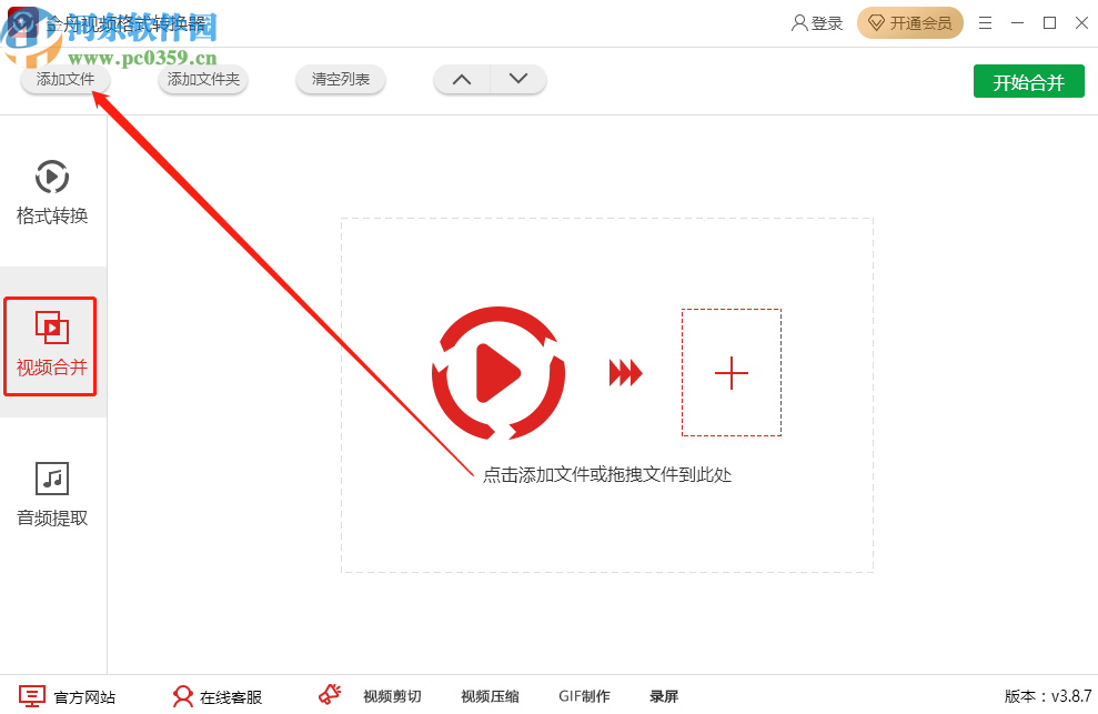 1.首先第一步我们打开软件之后切换到视频合并功能界面,然后在界面左上角点击添加文件按钮,点击之后准备添加想要合并的视频。