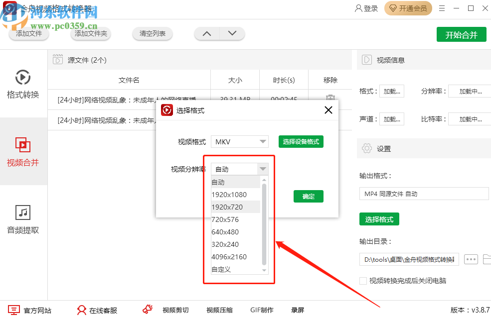 4.设置好合并视频的输出格式之后我们点击视频分辨率的下拉列表,可以在其中选择自己想要使用的视频分辨率。