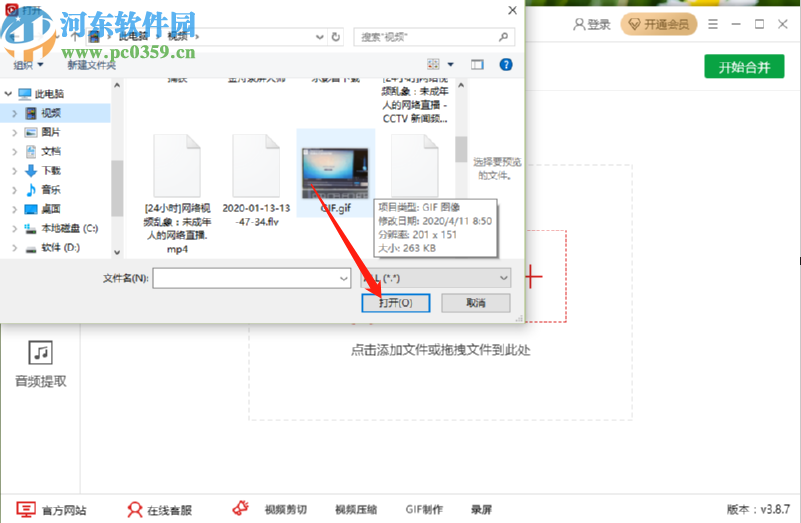 2.点击添加文件按钮之后,接下来我们在出现的选择文件界面中,选中想要合并的视频文件之后点击下方的打开按钮即可。