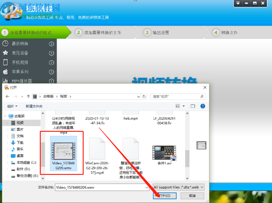 3.点击添加文件之后下一步在打开的选择文件界面中选中目标视频文件之后,点击右下角的打开按钮即可。