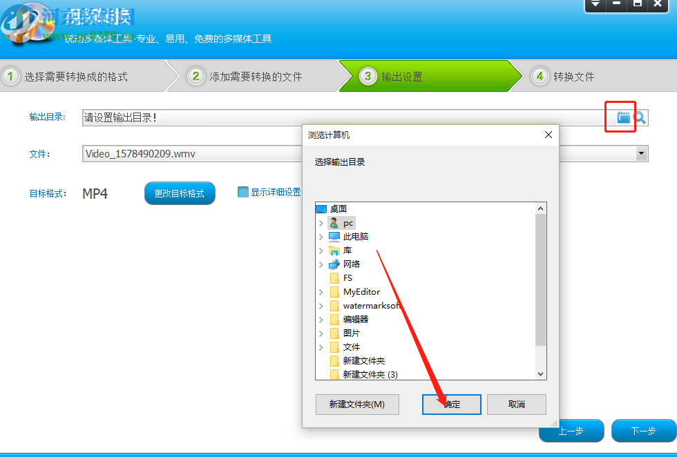 5.点击确定按钮之后我们进入到输出设置界面,点击设置界面输出目录的文件夹图标,然后在出现的选择文件目录界面中根据自己的需求设置文件输出目录。