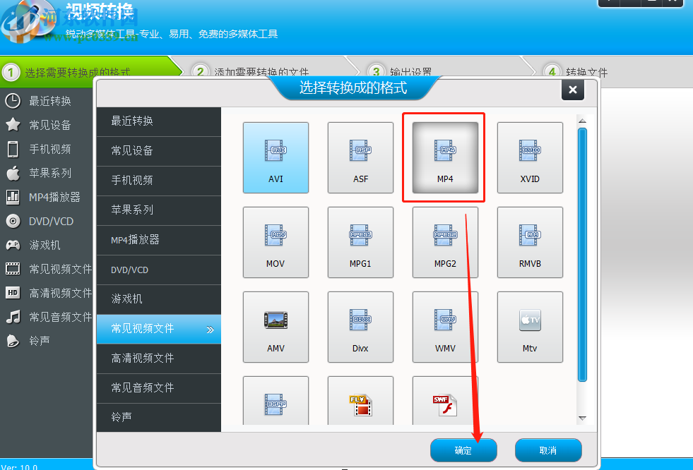4.点击打开按钮之后选择好视频文件,然后下一步是需要选择想要转换的视频文件格式,选择为MP4格式之后点击下方的确定按钮。