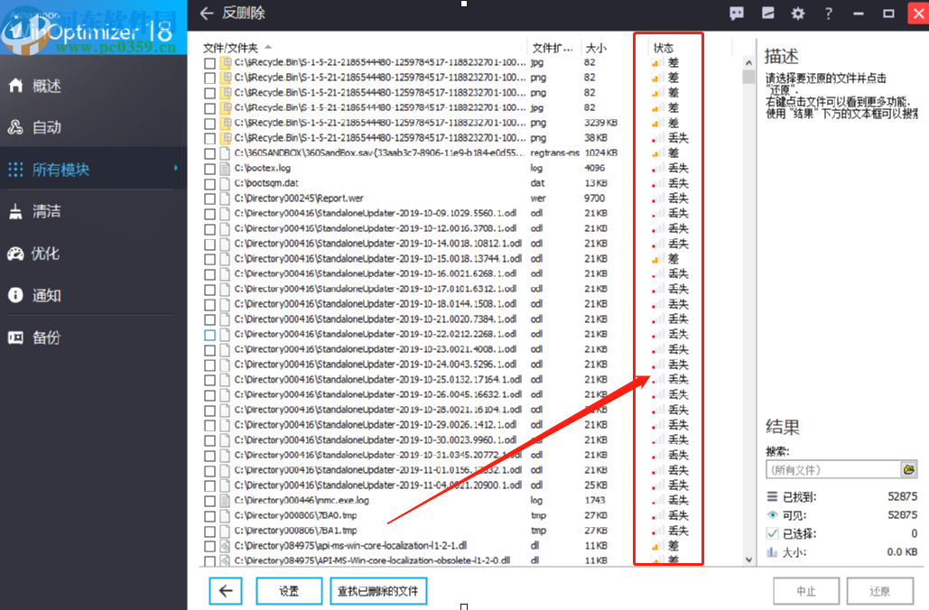 3.点击确定按钮之后软件就会自动开始扫描,不一会就能够扫描完成了,然后我们在扫描出的文件中可以看到文件的状态。