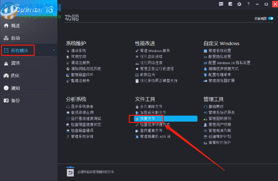 1.首先第一步我们打开软件之后点击所有模块,然后在右边的文件工具中找到恢复文件这个功能,找到之后点击进入到其中。