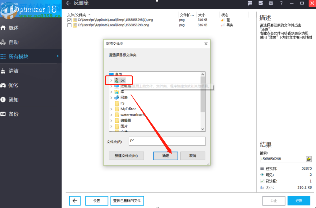 6.点击还原之后在出现的选择保存恢复文件路径的界面,选择自己想要保存恢复的文件路径之后点击确定按钮就可以了。