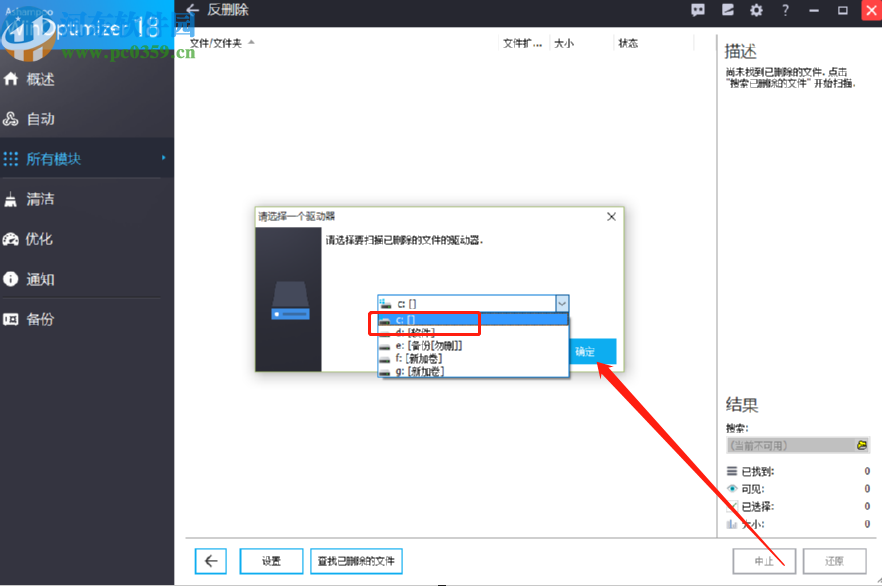 2.点击进入到恢复文件的功能界面之后需要先选择想要扫描恢复删除文件的磁盘,我们根据需求选择之后点击确定按钮。