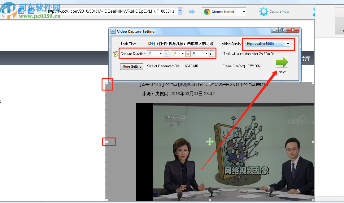 4.点击之后下一步就出现一个录制设置界面了,我们可以设置录制的时间和视频清晰度,然后在下方的阴影位置可以调整录制区域的大小,全部根据自己的需求设置完成之后点击Next按钮。