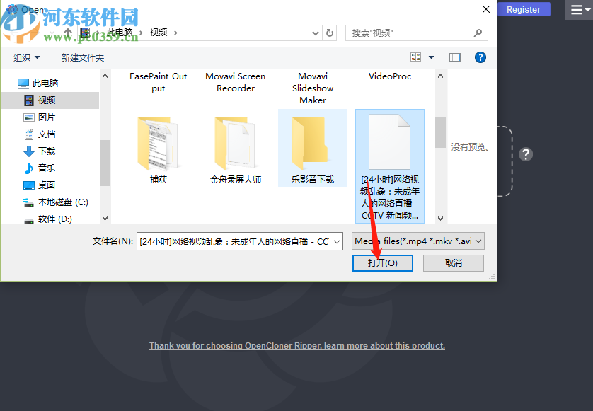 2.点击这个添加视频模块之后会出现一个选择视频文件的界面,在这个界面中我们选中想要裁剪的视频之后点击打开按钮。