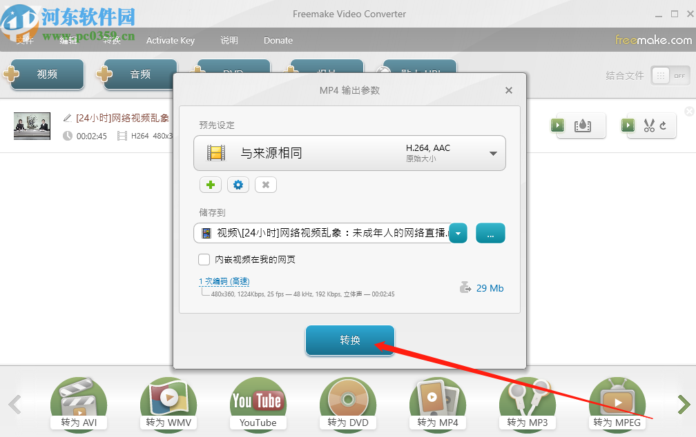 7.点击转换之后在输出参数界面可以设置储存的路径,设置完成之后点击下方的转换按钮就可以将剪切之后的视频保存下来了。