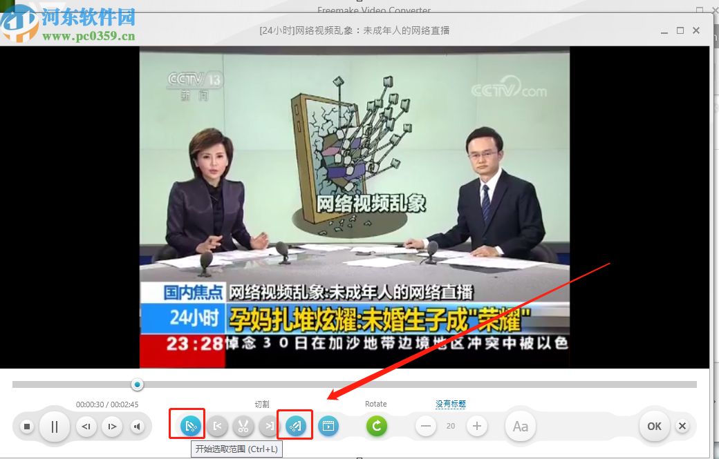 4.进入到剪切视频的界面中之后,我们看到下图中框出的这两个图标,左边是选择剪切开始时间的,右边是选择剪切结束时间的。