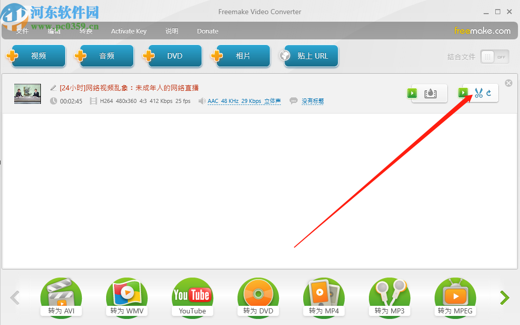 3.将需要剪切的视频成功添加到软件界面之后,我们点击视频列表右边的剪刀图标即可进入到视频剪切界面,如下图中所示。