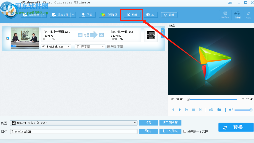 3.点击打开按钮将视频添加进去之后,下一步我们点击上方的剪辑这个功能按钮进入到剪切视频的界面。