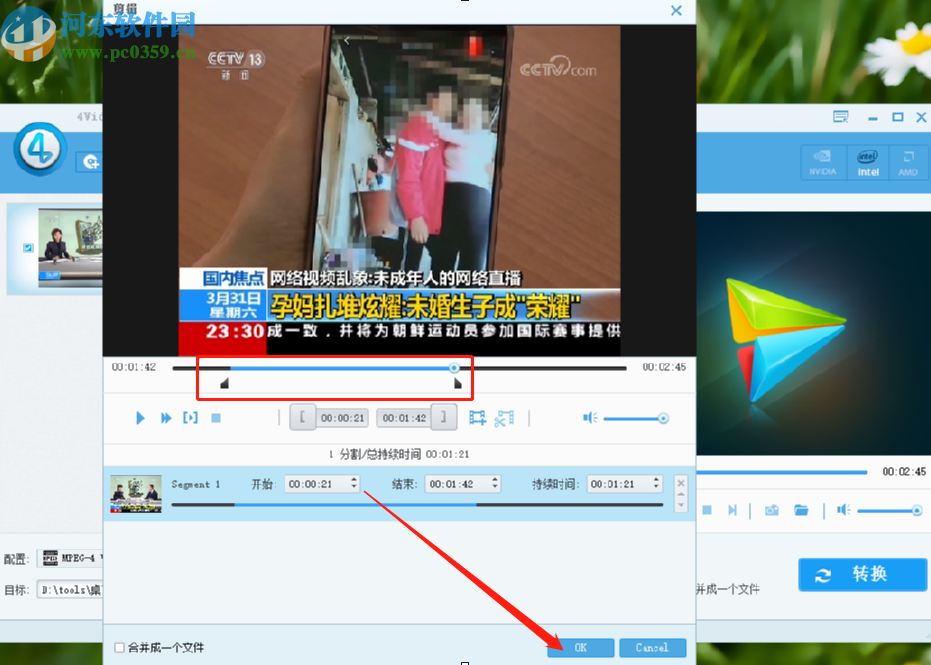 5.选择好想要剪切的片段之后,在界面中可以看到已经生成的剪切片段,然后我们点击下方的OK按钮即可。
