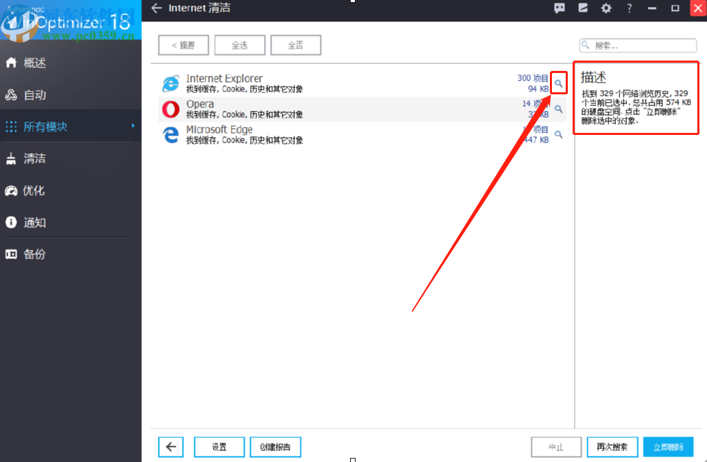 3.等到扫描操作完成之后,我们在右边的描述这个模块中可以看到扫描出了多少网络浏览历史,以及它们占用了多少磁盘空间,点击放大镜图标可以查看具体的历史文件。