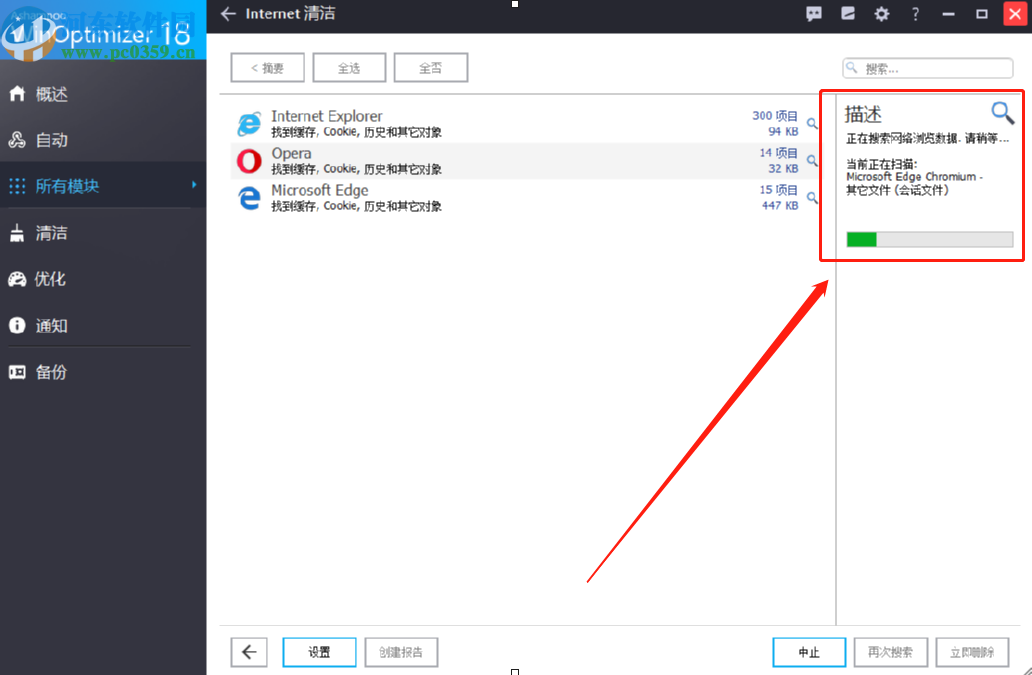 2.点击清除网络浏览历史功能之后会自动开始扫描操作,在界面右边可以看到扫描浏览历史的进度,我们只需要耐心的等待扫描完成即可。
