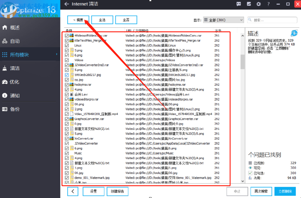 4.点击进入到查看浏览历史具体文件界面之后如下图,我们可以看到他们的名称和路径字节等信息,点击上方的摘要按钮可以返回上一步。