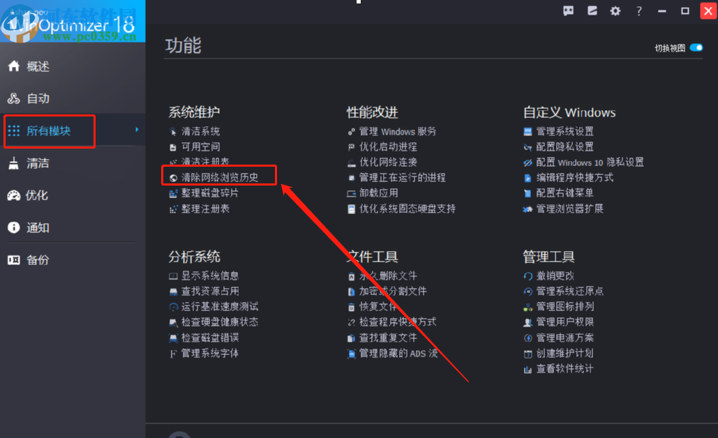 1.首先第一步我们打开软件之后在界面左边点击所有模块,点击之后在右边的系统维护功能中找到清除网络浏览历史这个功能选项点击进去。