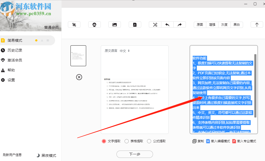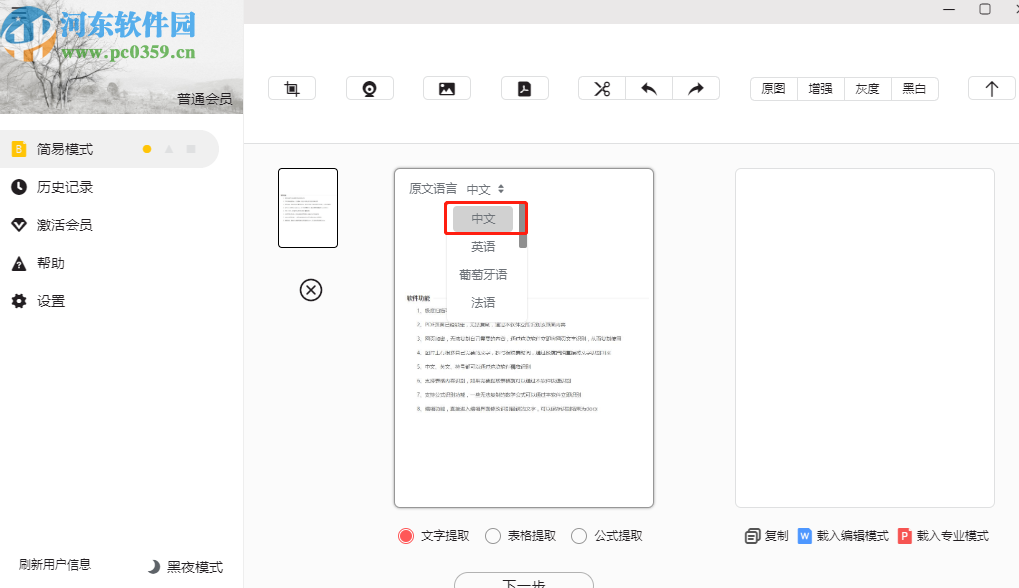 4.设置好原文语言之后,我们点击选中下方的文字提取功能,选中之后点击下一步按钮即可开始识别文字的操作。