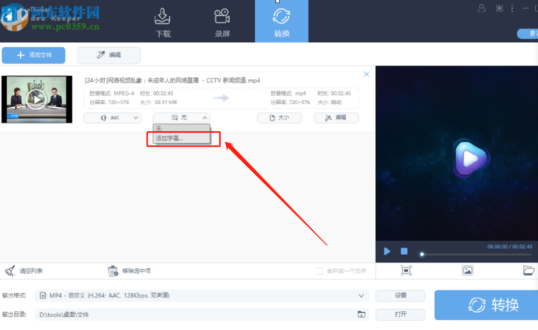 3.视频加载到软件界面之后,我们点击字幕功能的下拉列表,然后在其中就可以看到添加字幕选项了。