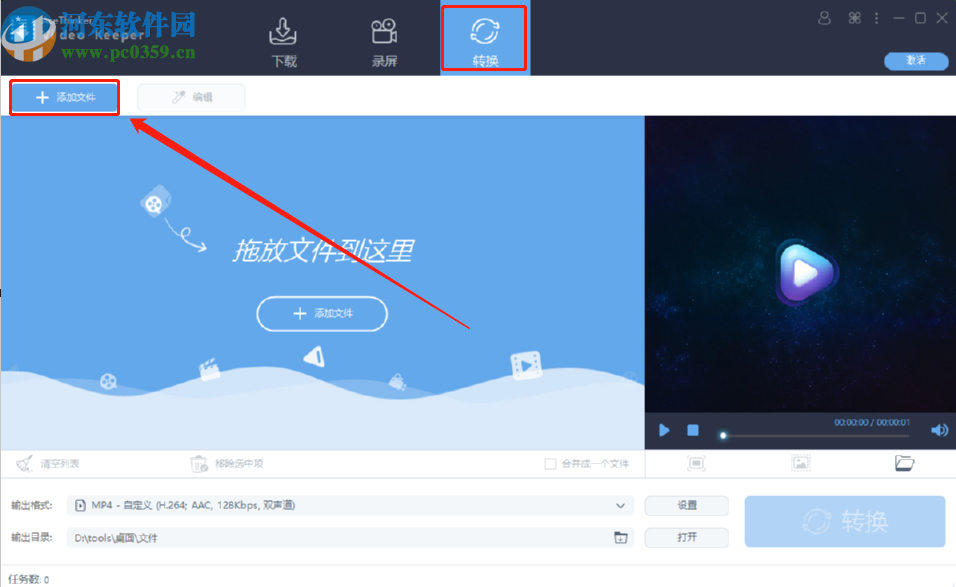 1.首先第一步我们打开软件之后选择转换这个功能模块,然后点击其中的添加文件按钮即可。