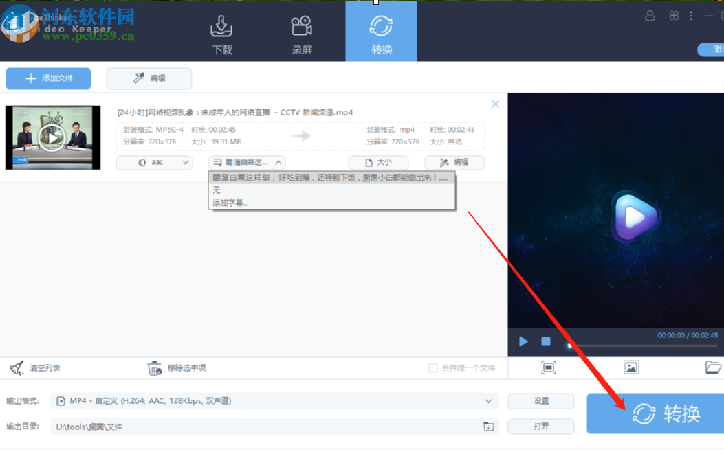 5.点击打开按钮之后回到软件主界面,此时字幕文件已经添加成功了,然后我们可以看到添加之后的字幕文件,点击右下角的转换即可将添加字幕之后的视频文件转换保存下来。