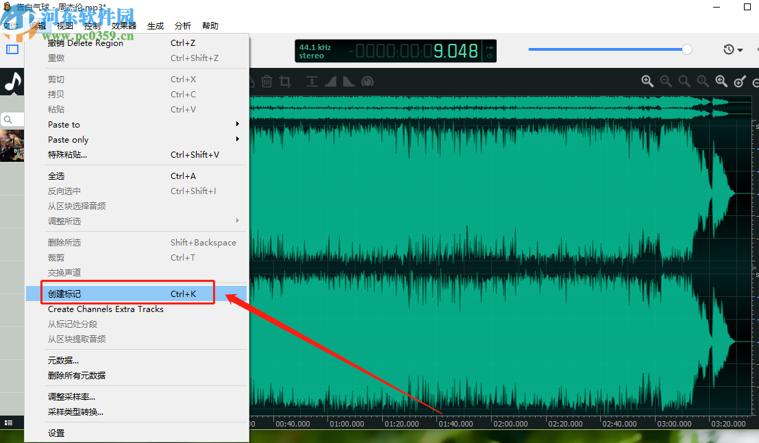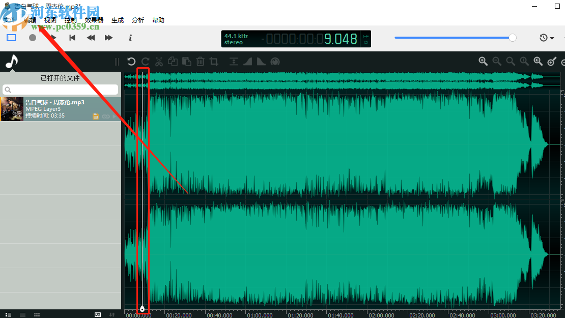 3.进入到音频文件的编辑界面之后,我们需要在音频轨道中选择想要创建标记的位置,选择之后点击上方的编辑功能。