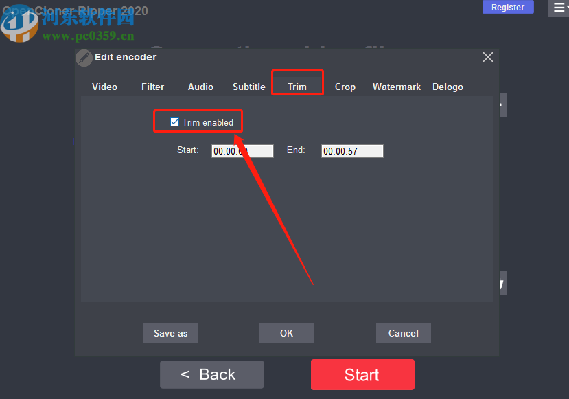 5.点击打开这个设置图标之后,在出现的设置界面切换到Trim剪切界面中,然后勾选Trim enabled这个选项。