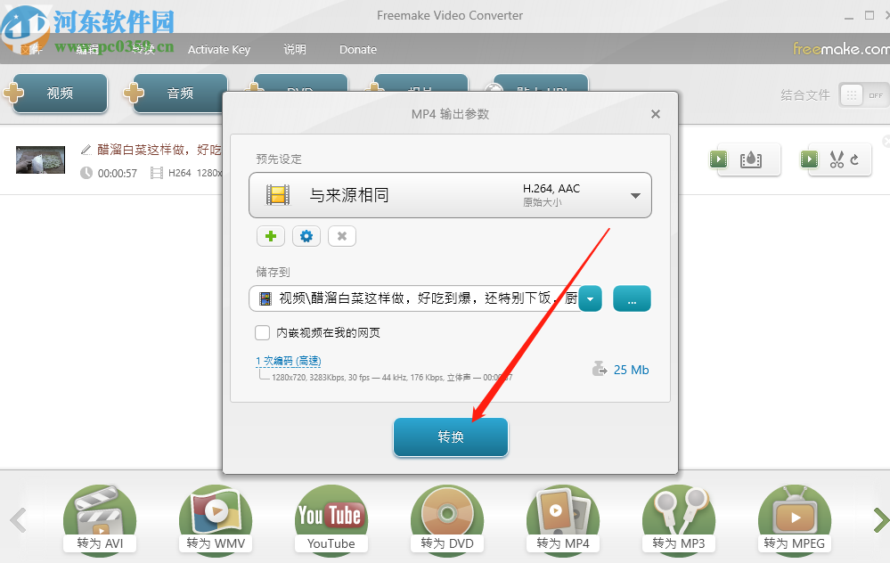 6.之后在转换参数设置界面我们点击转换按钮就可以将添加音频之后的视频文件转换保存下来了。