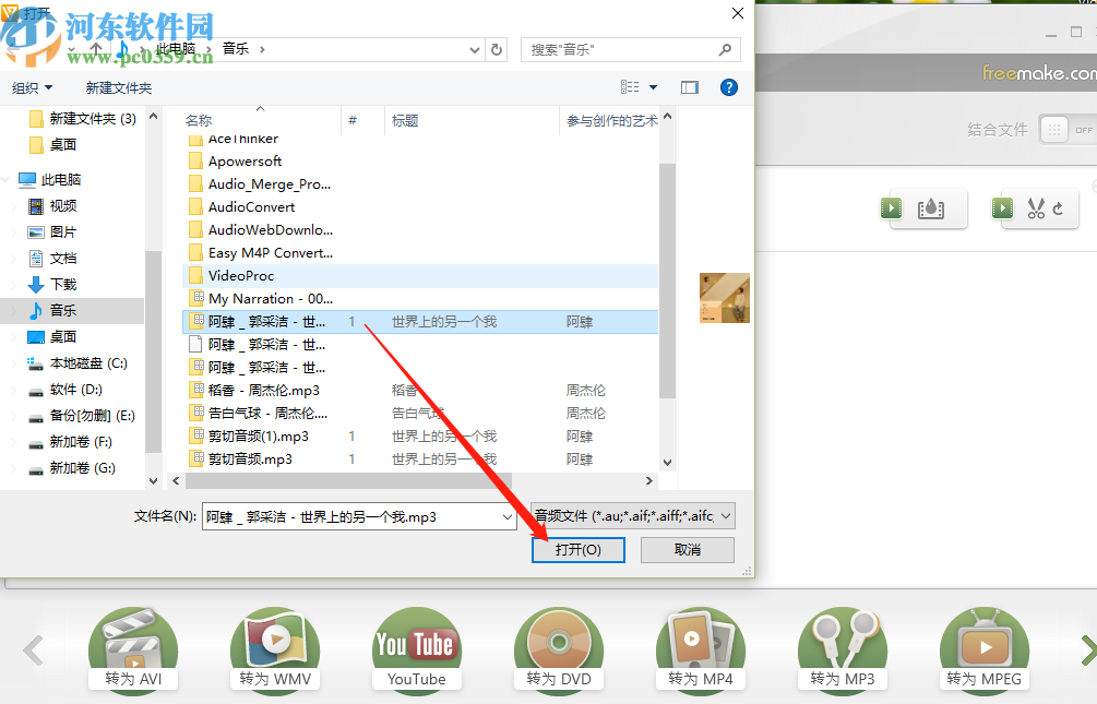 4.点击加入音频之后会打开选择音频文件的界面,我们选择想要添加的音频之后点击打开按钮。