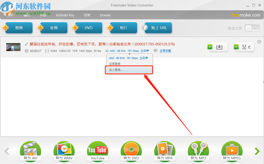 3.点击打开将视频添加到软件界面之后,在界面中可以看到视频文件,我们点击它的音频选项就会出现加入音频这个功能了。