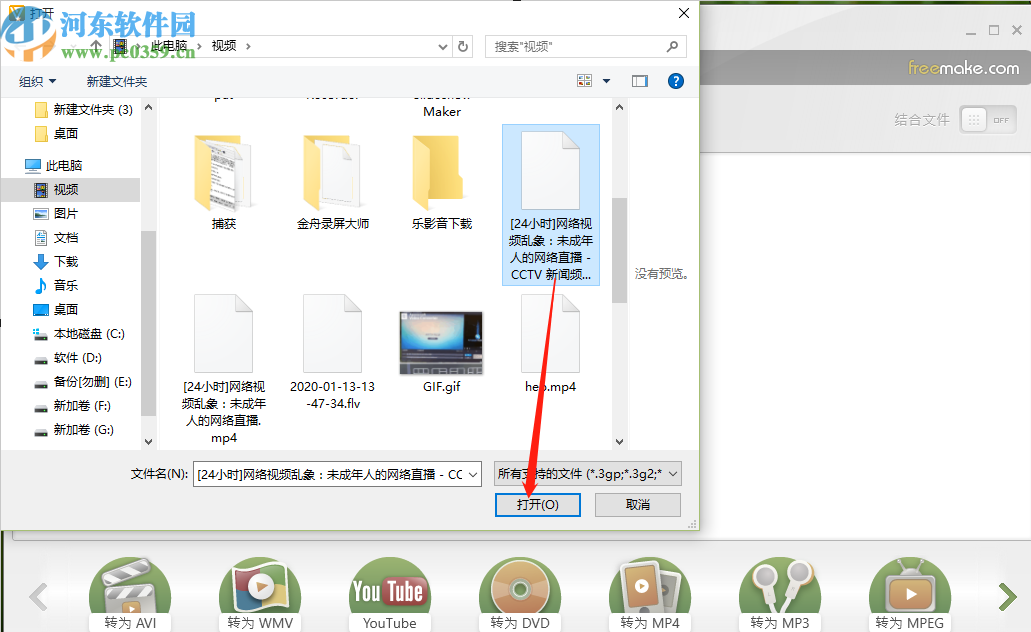 2.点击添加视频按钮之后,下一步在出现的界面中选择想要添加音频的视频文件,选中之后点击打开即可。