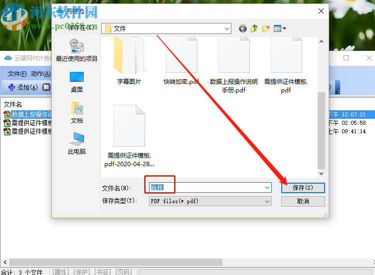 5.点击合并之后会出现一个选择保存位置和设置合并文件名称的界面,我们根据自己的具体情况设置完成之后点击保存按钮即可开始合并保存文件。