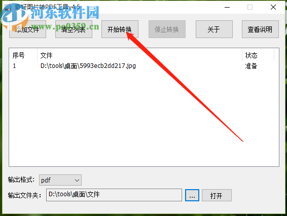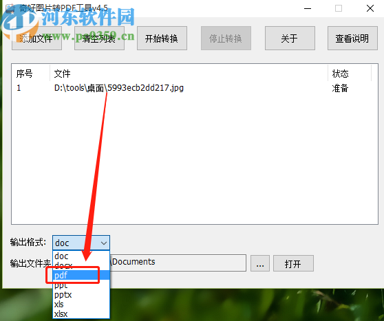 3.点击打开按钮之后我们就可以在界面中看到添加进来的图片文件了,接着点击下方的输出格式列表,选择PDF文件格式。