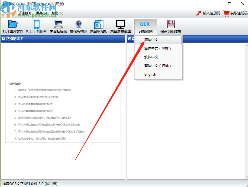 3.之后下一步截图就会显示到软件的待识别图片当中了,然后我们点击右上方的开始识别按钮,点击之后在出现的选项中选择想要识别的文字语言类型。