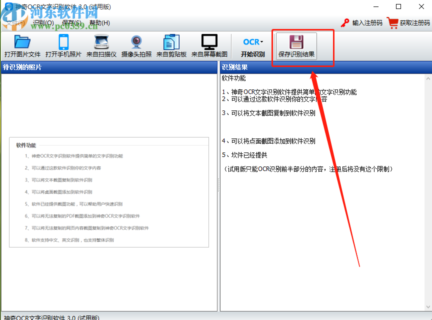 4.点击语言类型之后软件就会自动开始识别操作,等待识别完成我们就可以在识别结果处看到识别出来的一些文字内容了,然后我们点击上方的保存识别结果按钮。