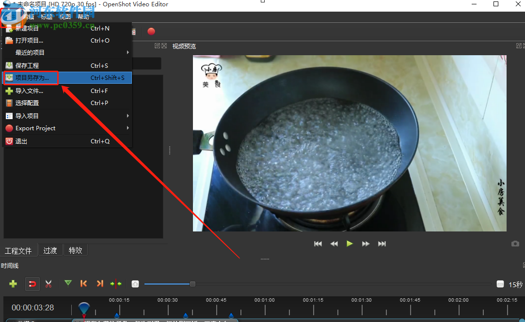 6.添加好标记之后我们需要点击左上角的文件选项,然后选择直接保存这个项目,而不是保存视频文件。